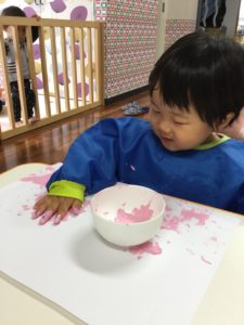 たんぽぽ組さんは、初めての絵の具(スタンプ台使用)でした