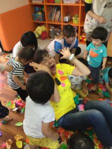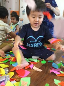 最後にはみんなで折り紙をちぎって作った落ち葉を、