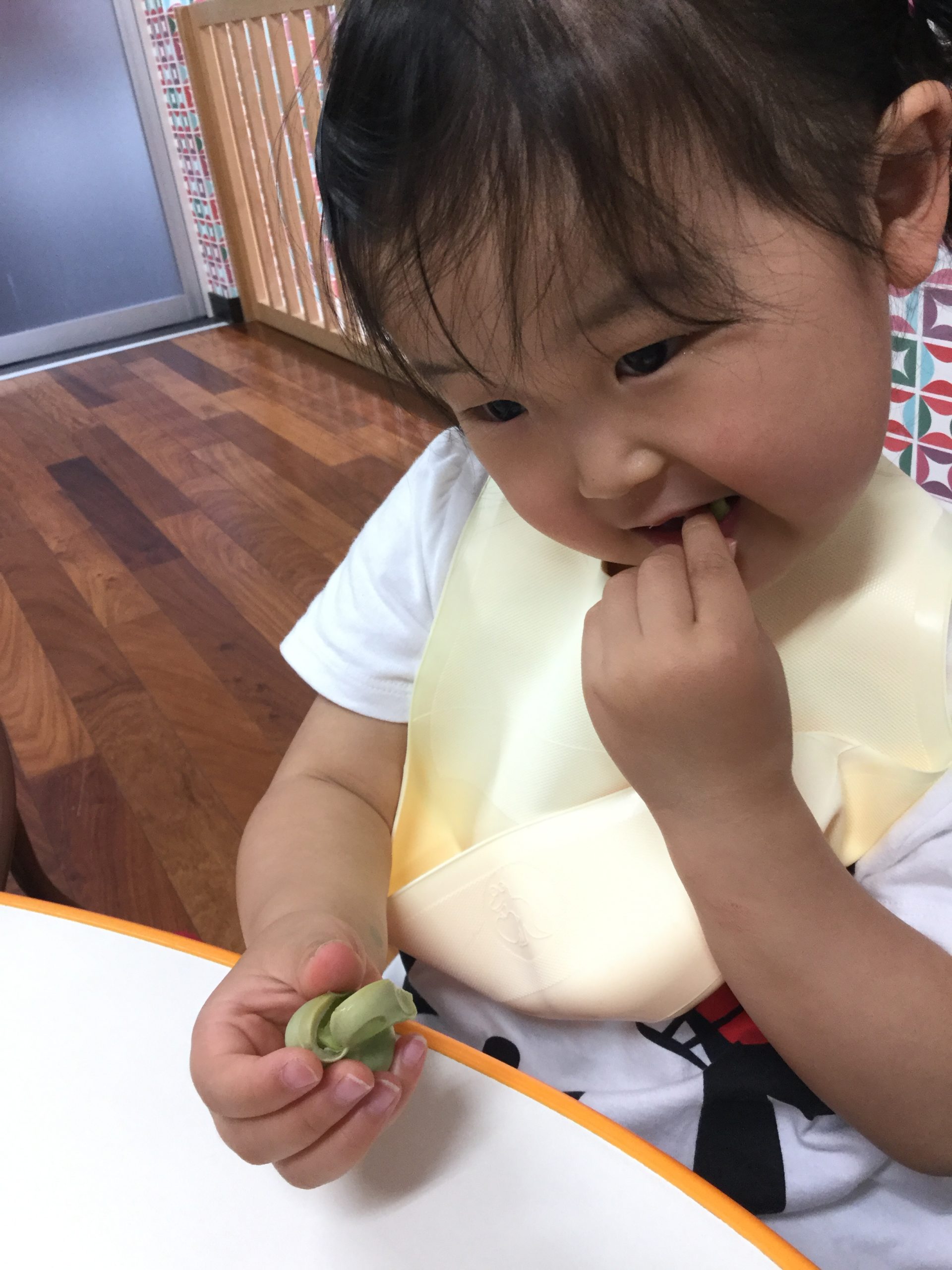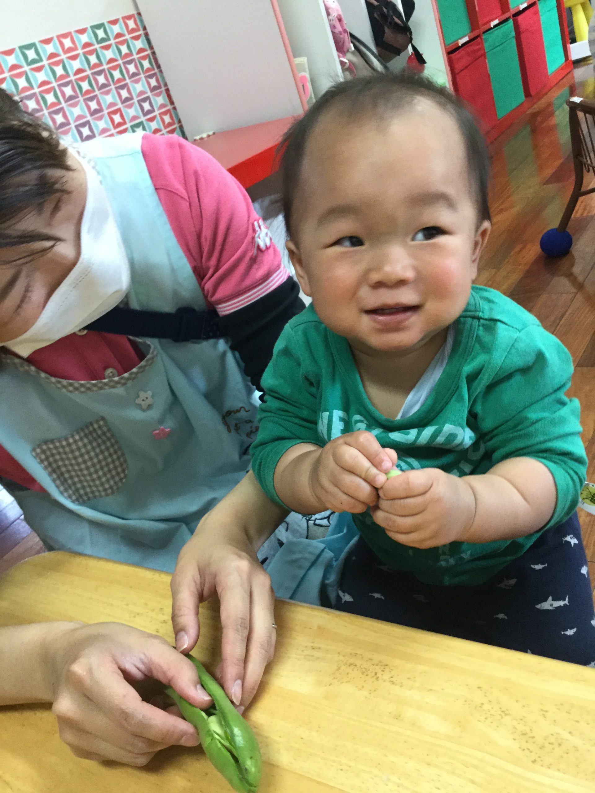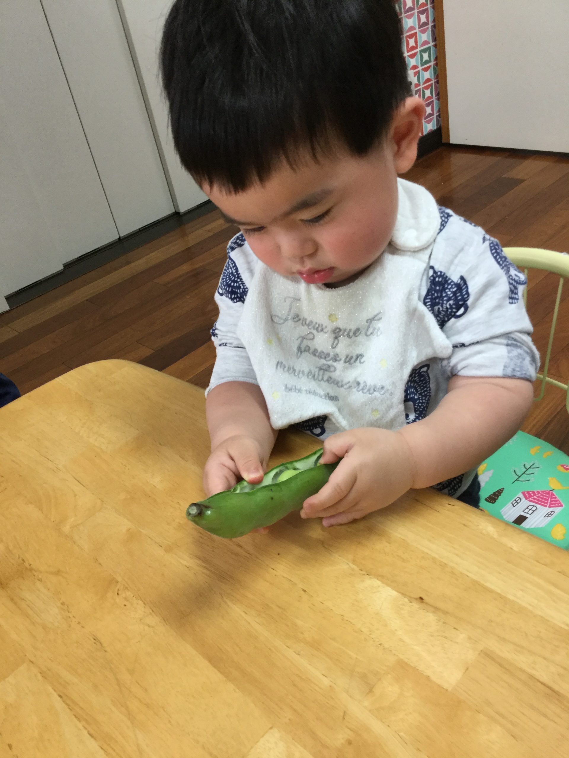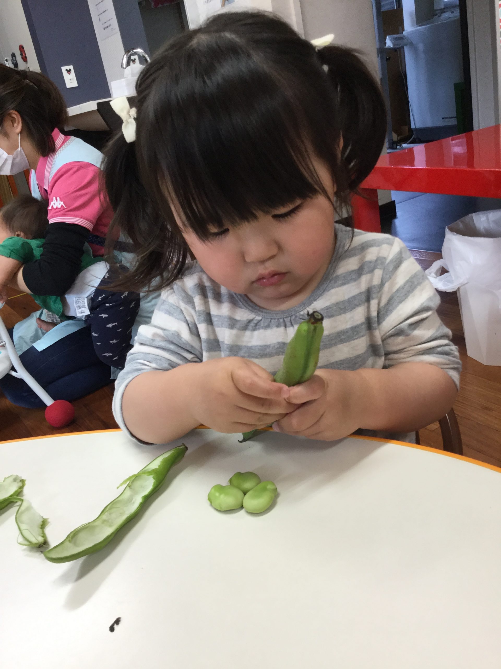 真剣にソラマメの皮をむいでいく子どもたちです。