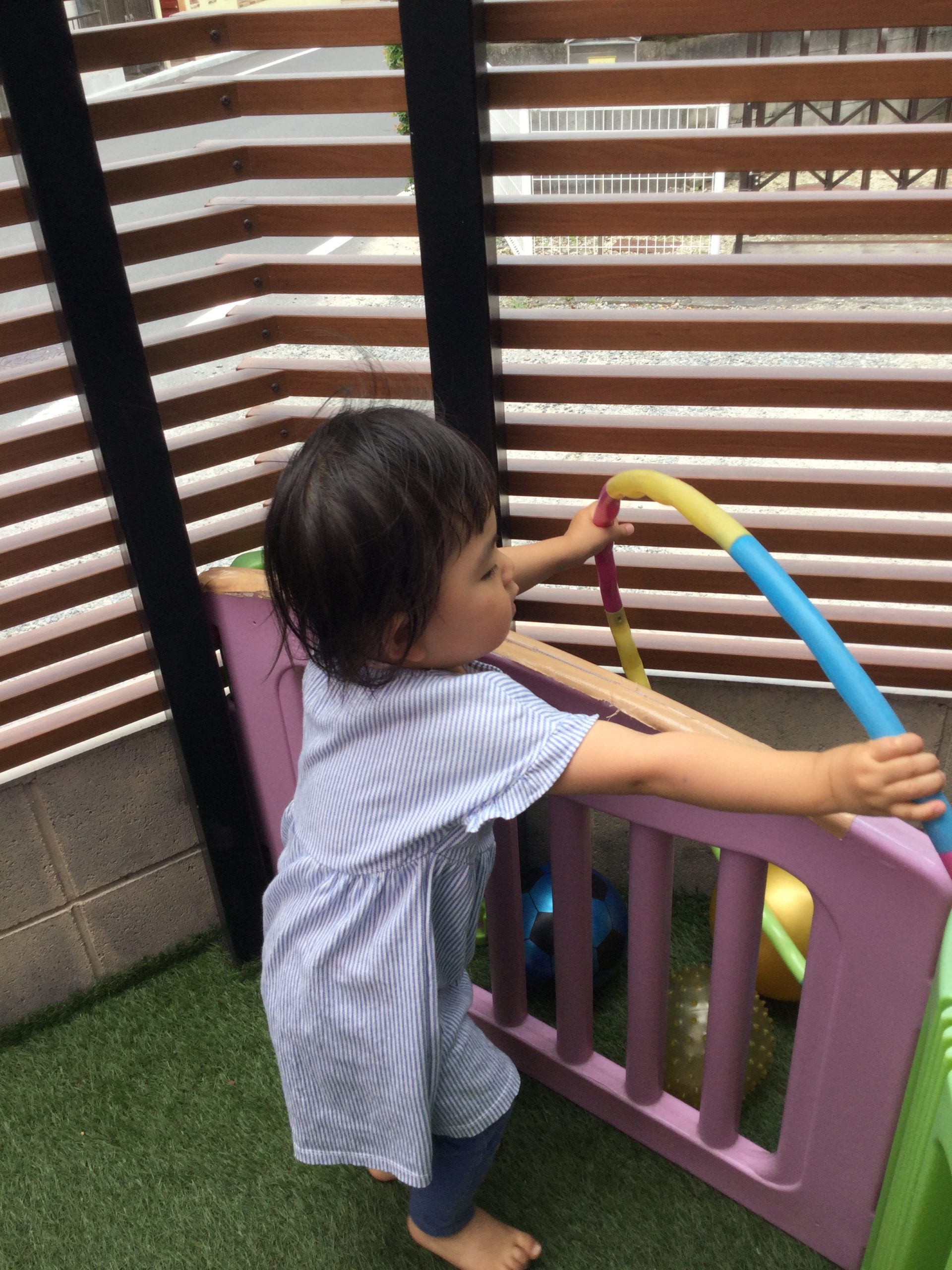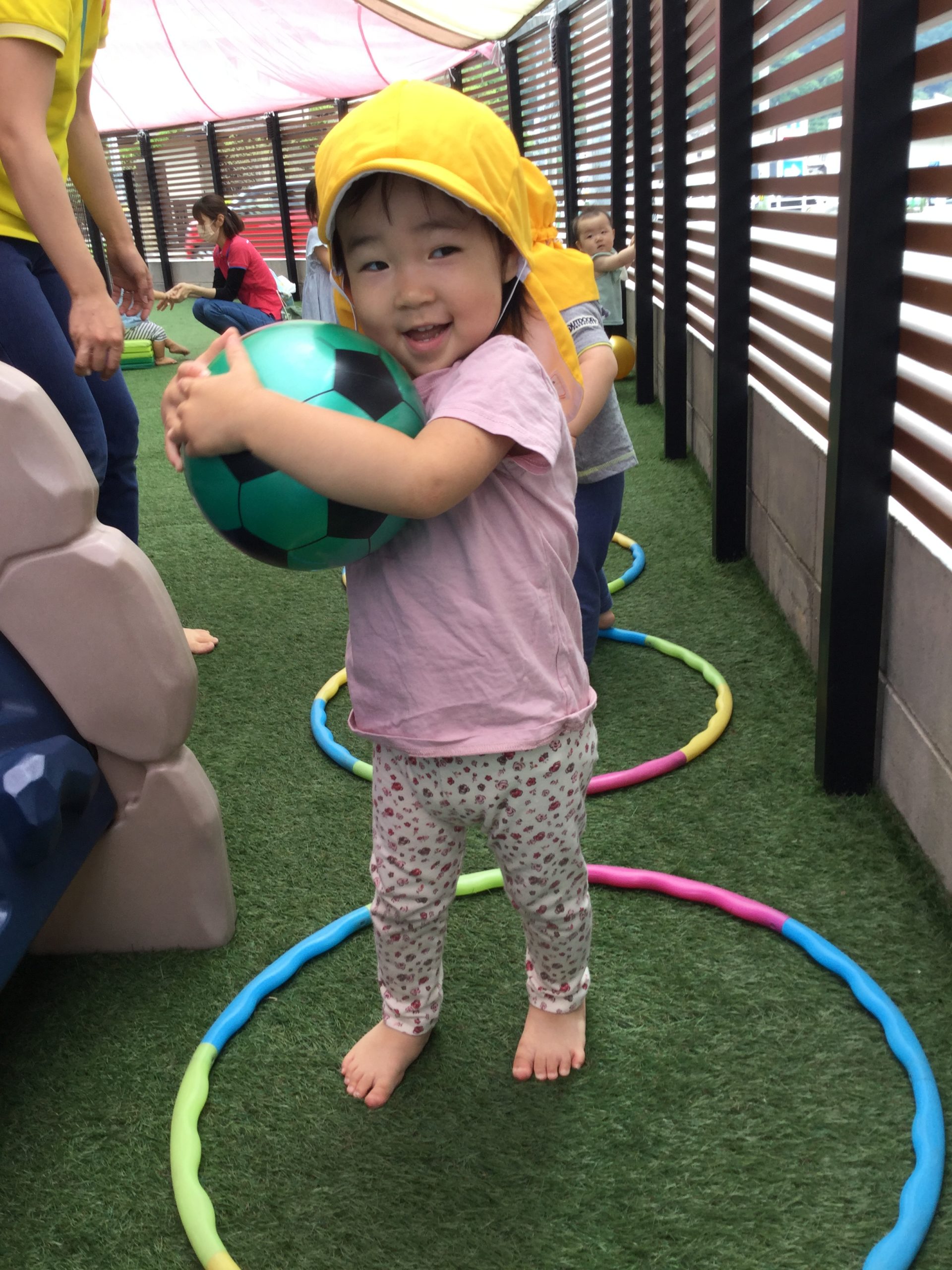 人工芝エリアで、フラフープやボール遊びなどを楽しむたんぽぽ組さん🥎⚽