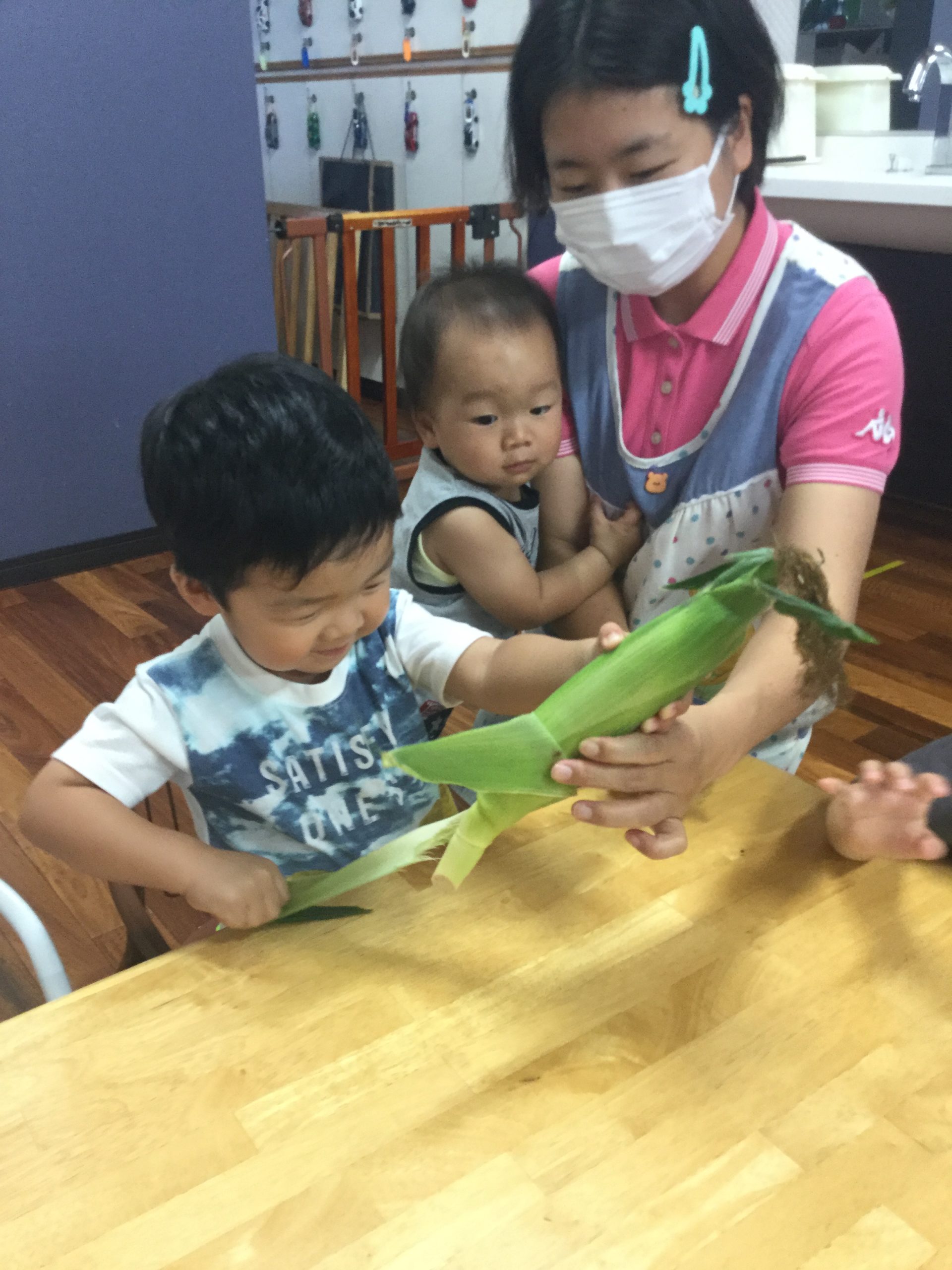 村上さんがとうもろこしを見せると、みんな興味津々で見つめていました👀✨