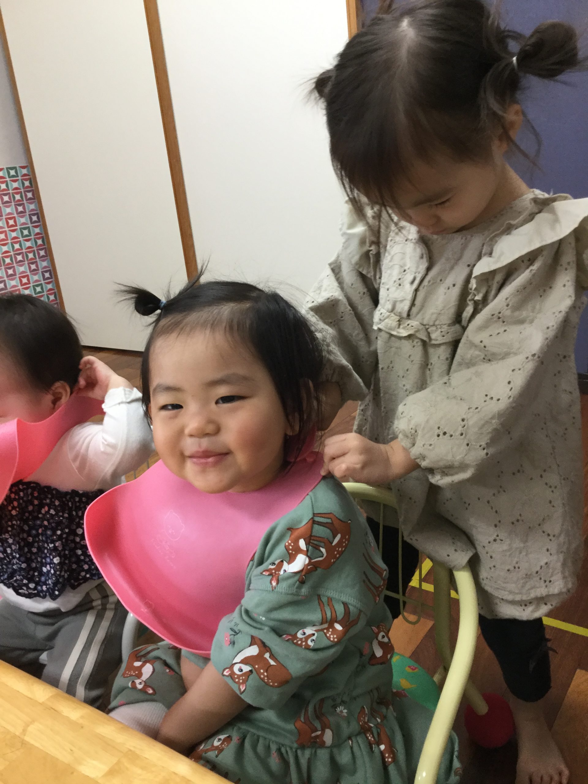 大好きなお姉ちゃんにエプロンを付けてもらいます🥰