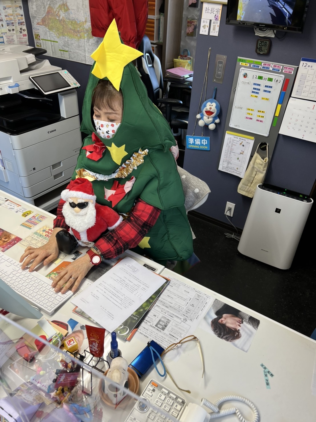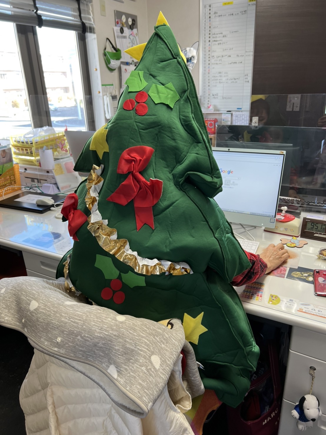 事務室では、ツリーに変身した専務がメールに返信中🎄(笑)