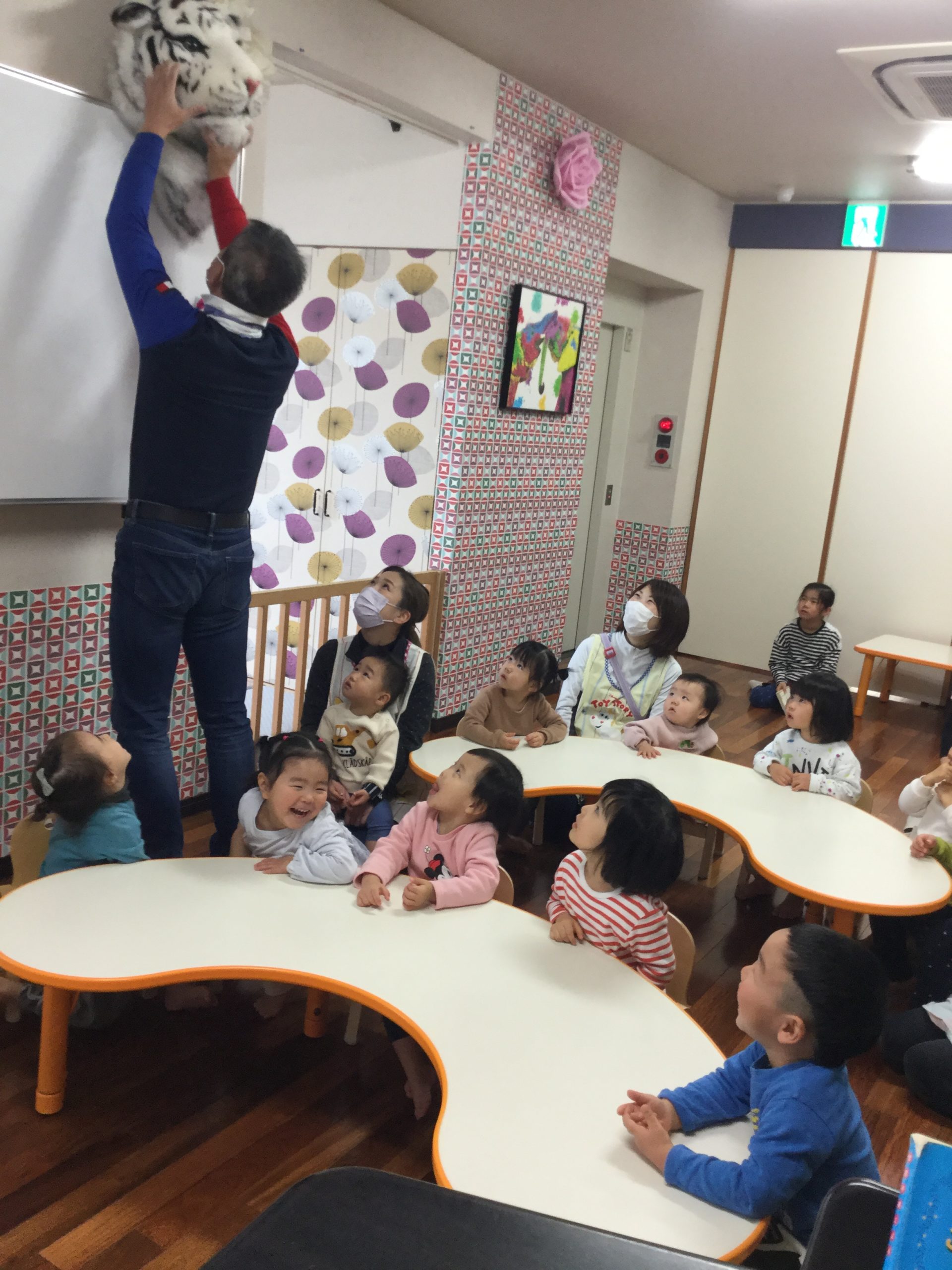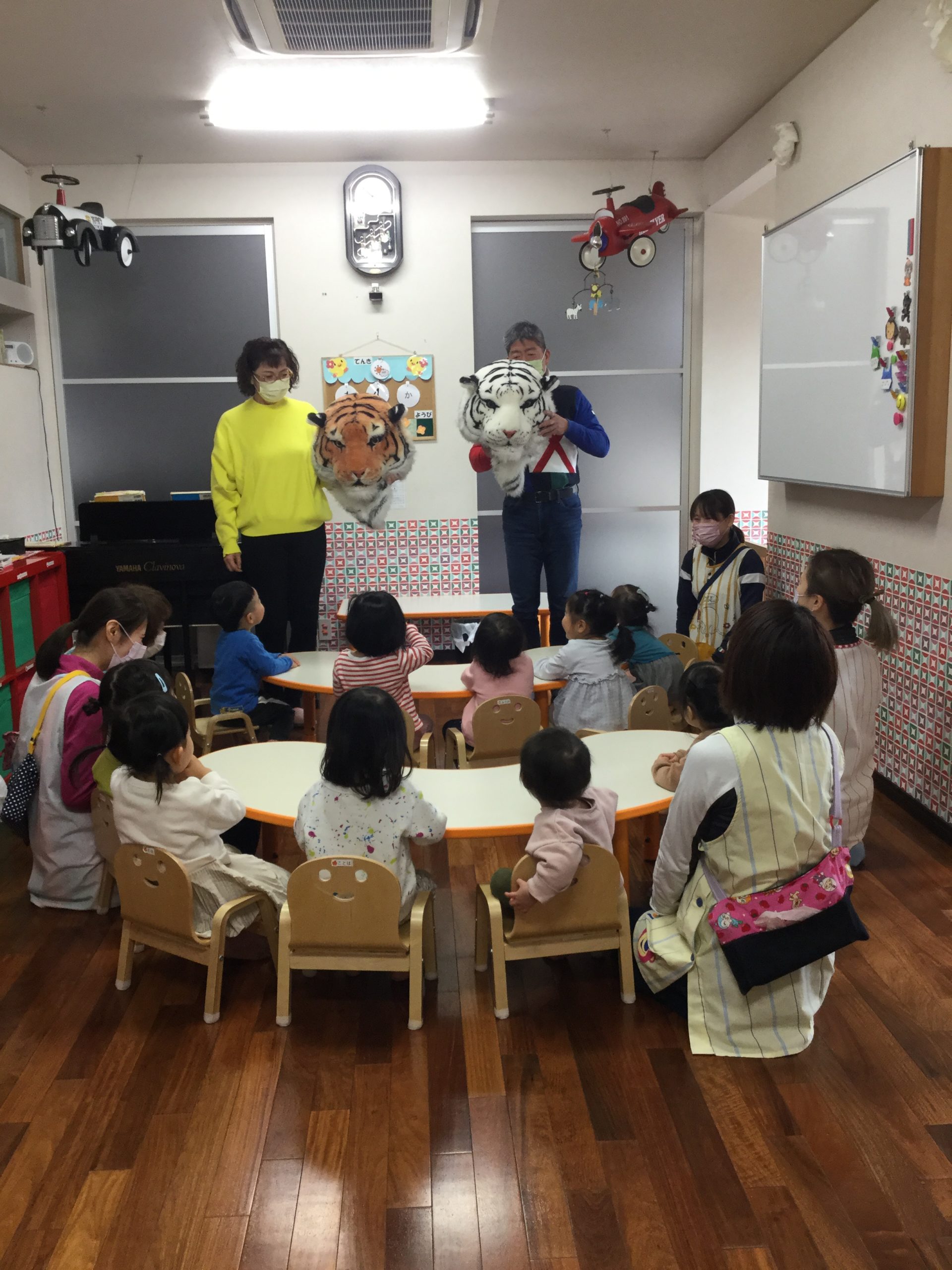 園長先生とゆうこ専務が、今年の干支「寅🐅」のお面を持って登場!!