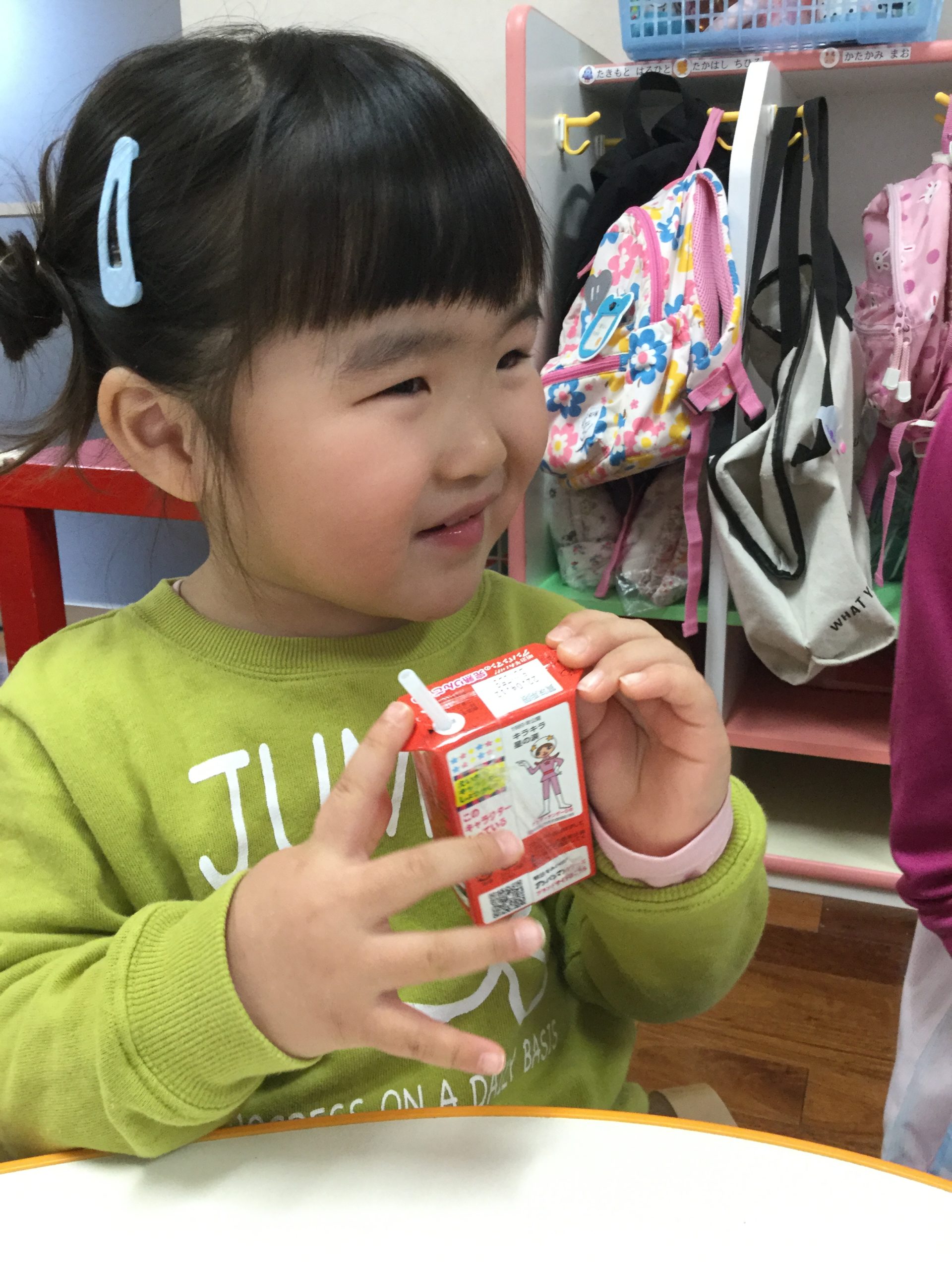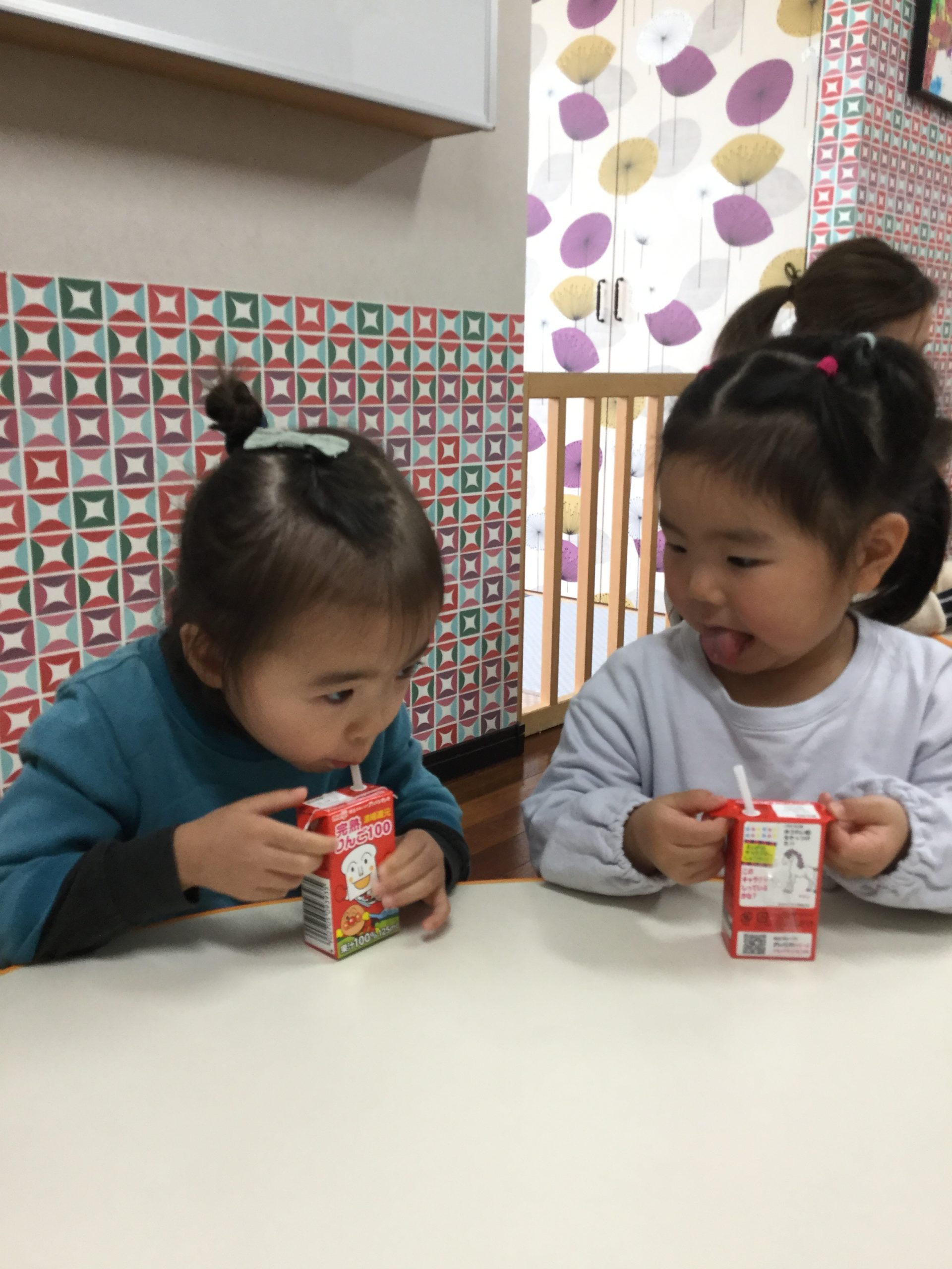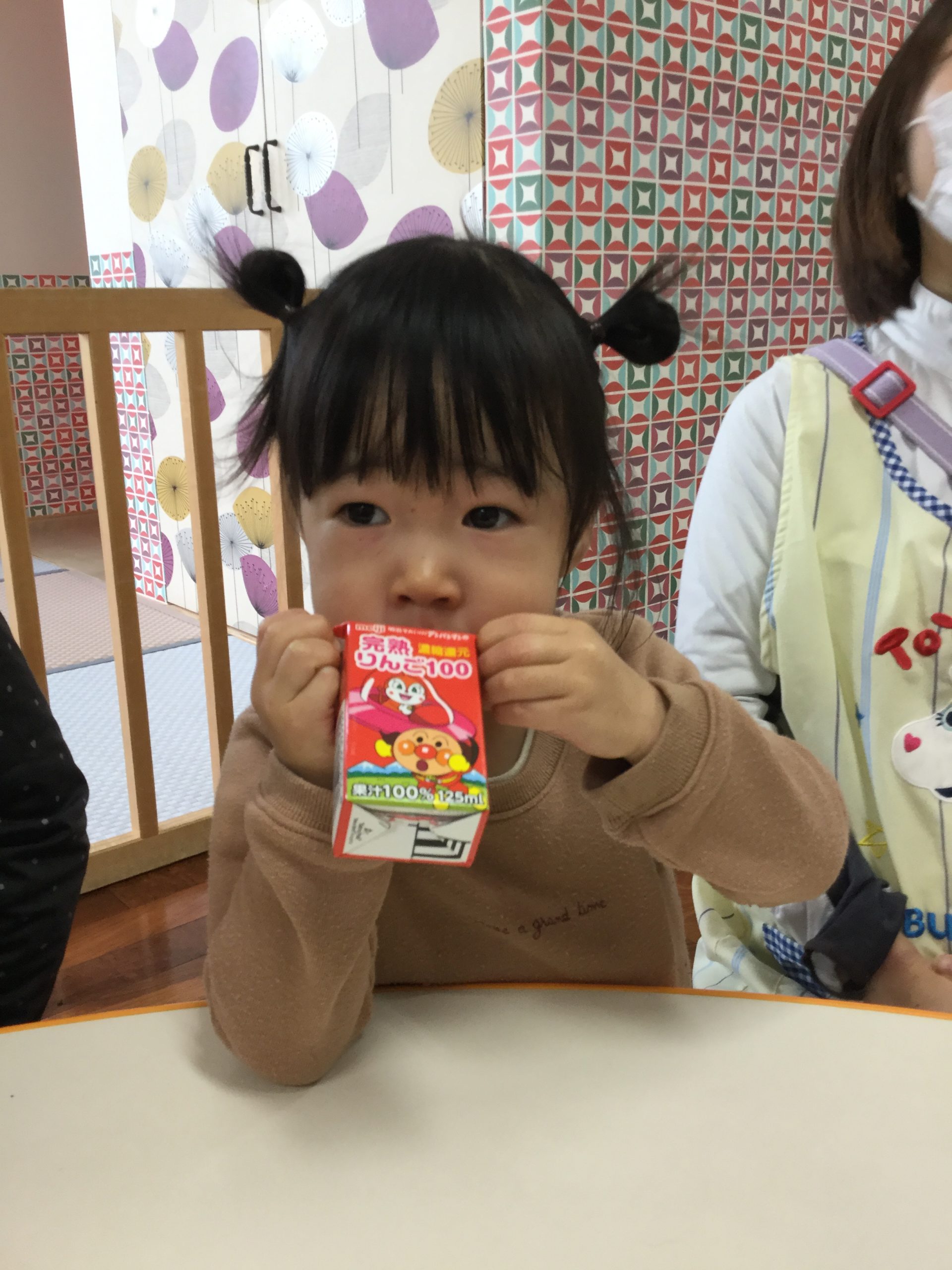 朝おやつはみんな大好き、アンパンマンジュースで新年の「かんぱーい🥛」