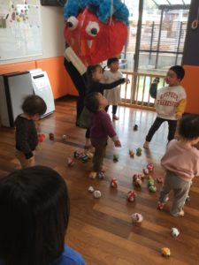 さあ、鬼さんに豆(この前作った新聞紙を丸めたボール)を投げるよ~!!