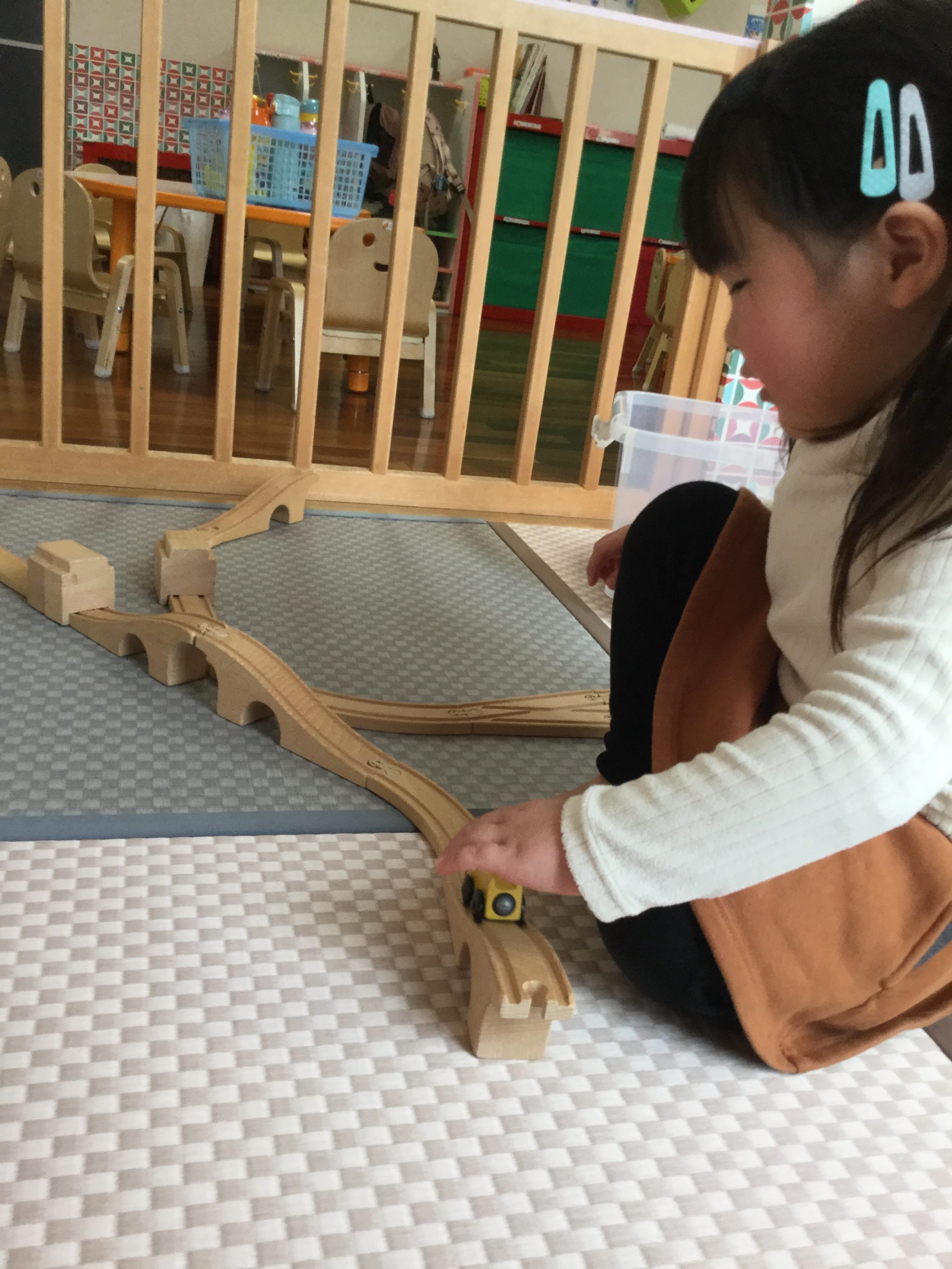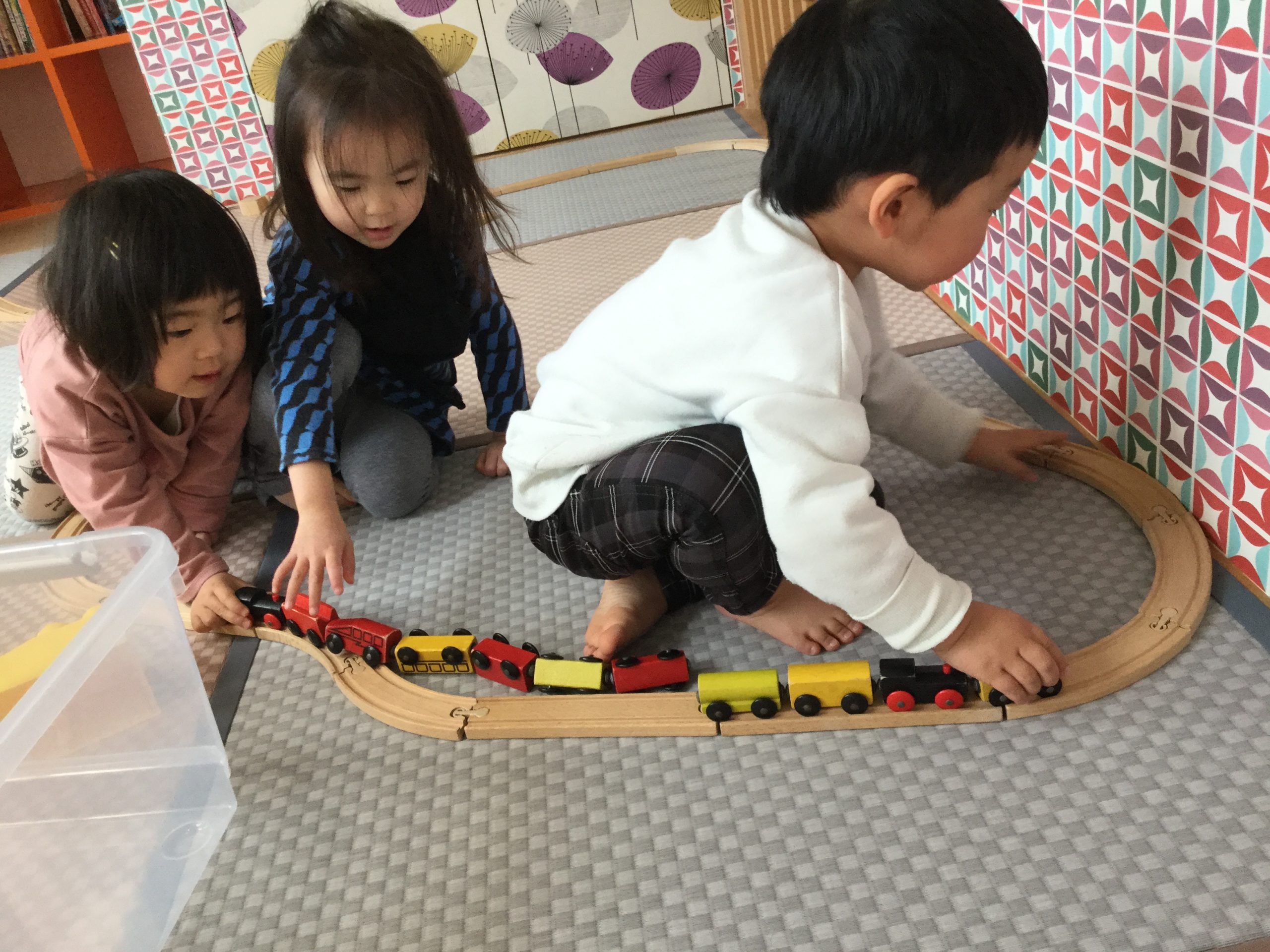 和室では、特大ブロックや木の列車でごっこ遊び🚃