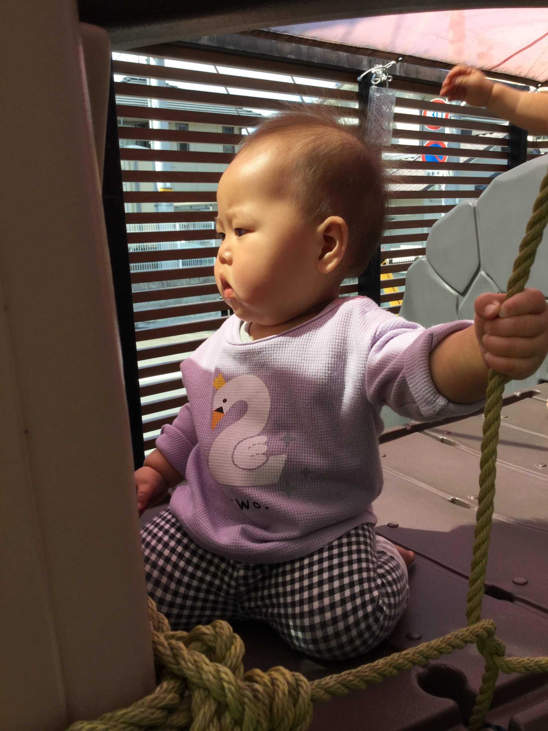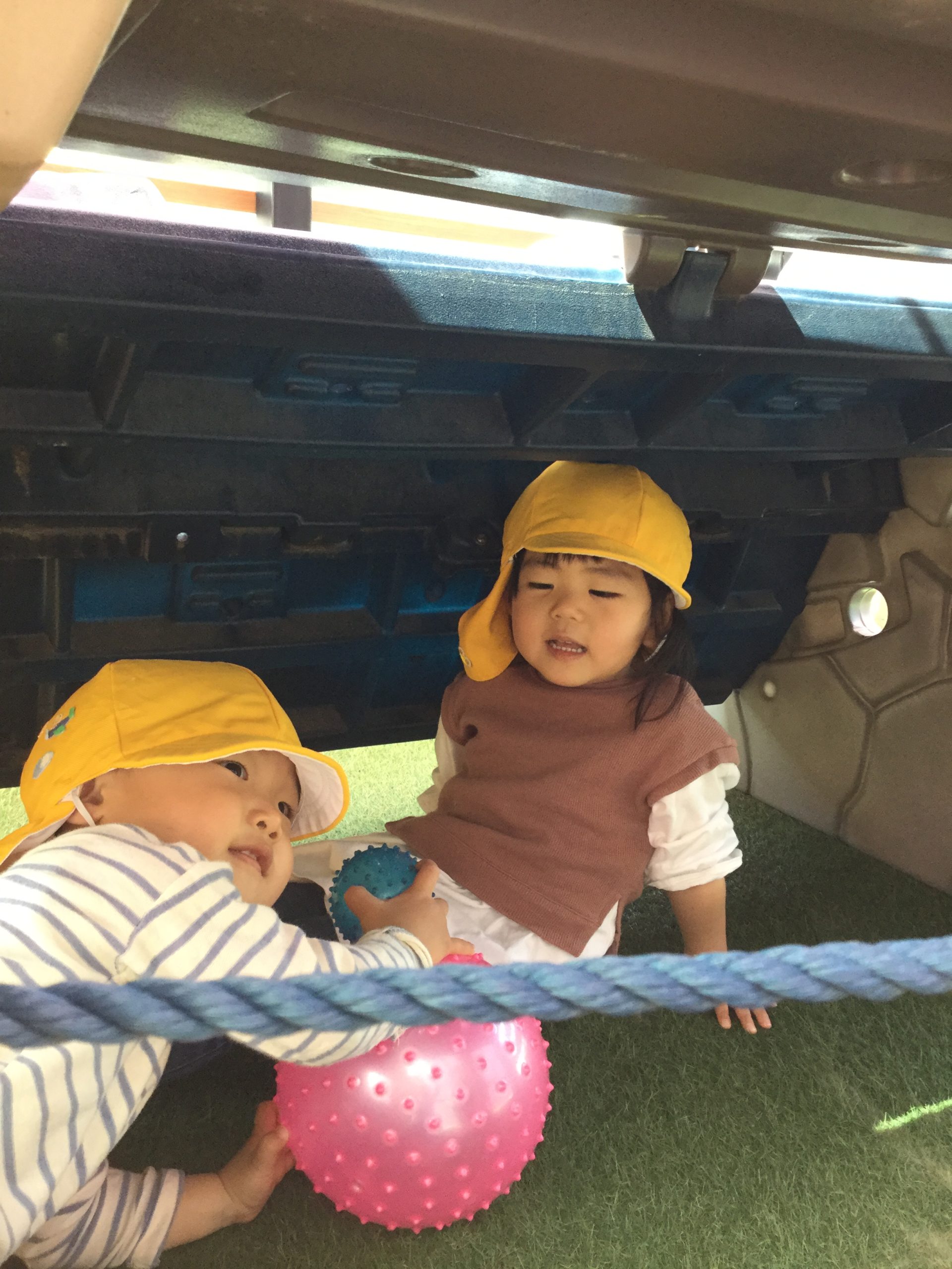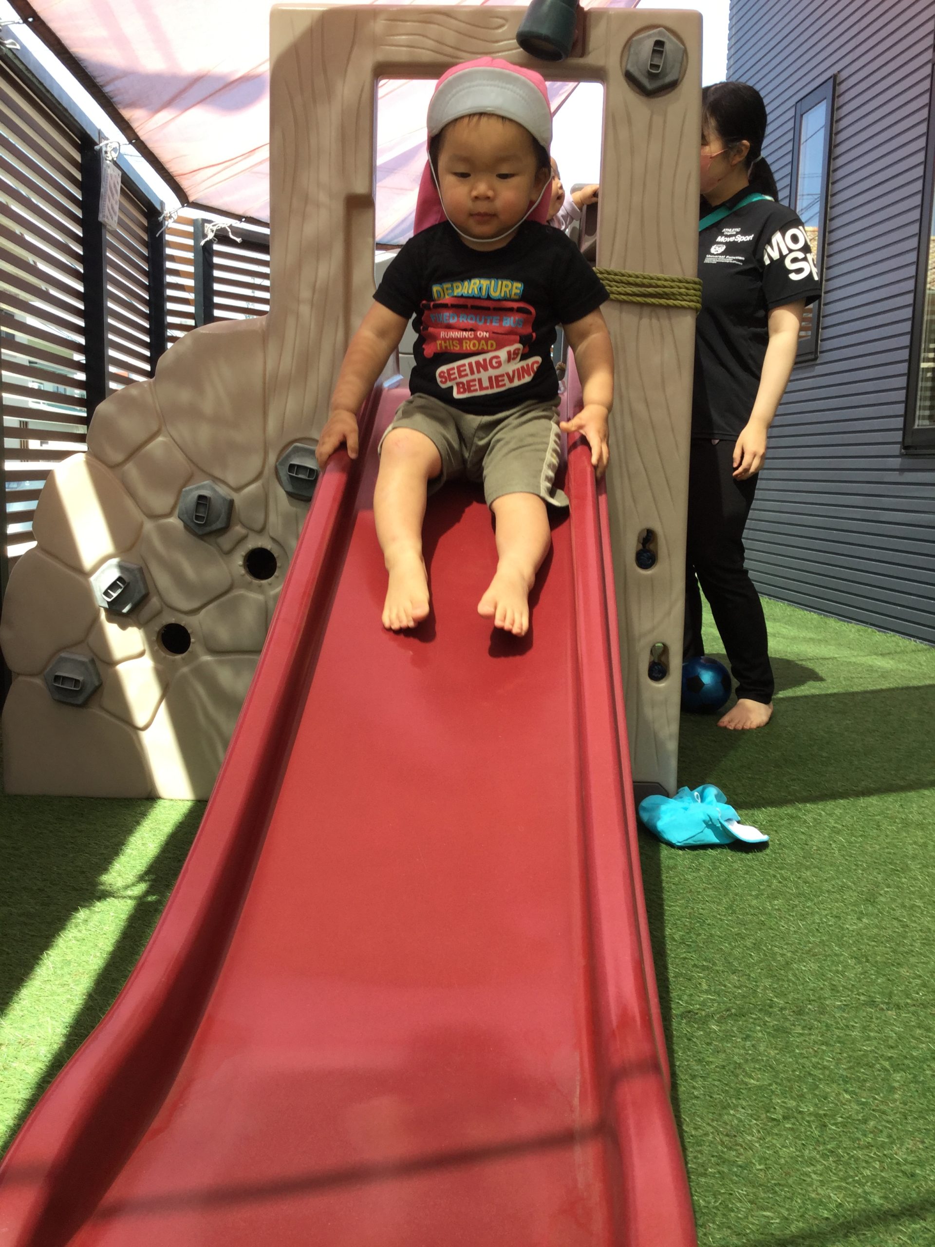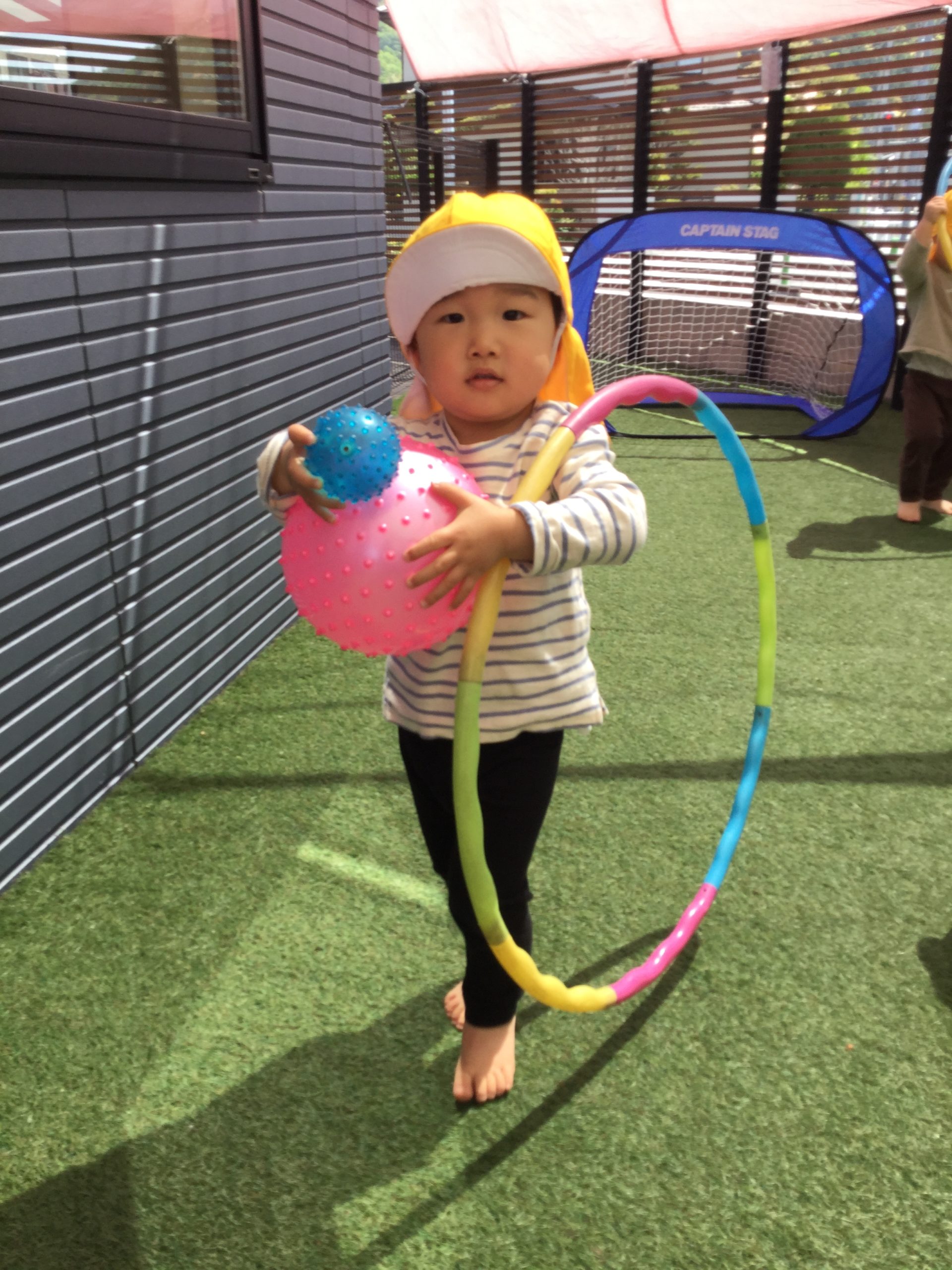 UVテントの下で、ボールを投げたり、滑り台をしたり、フラフープで遊んだり。