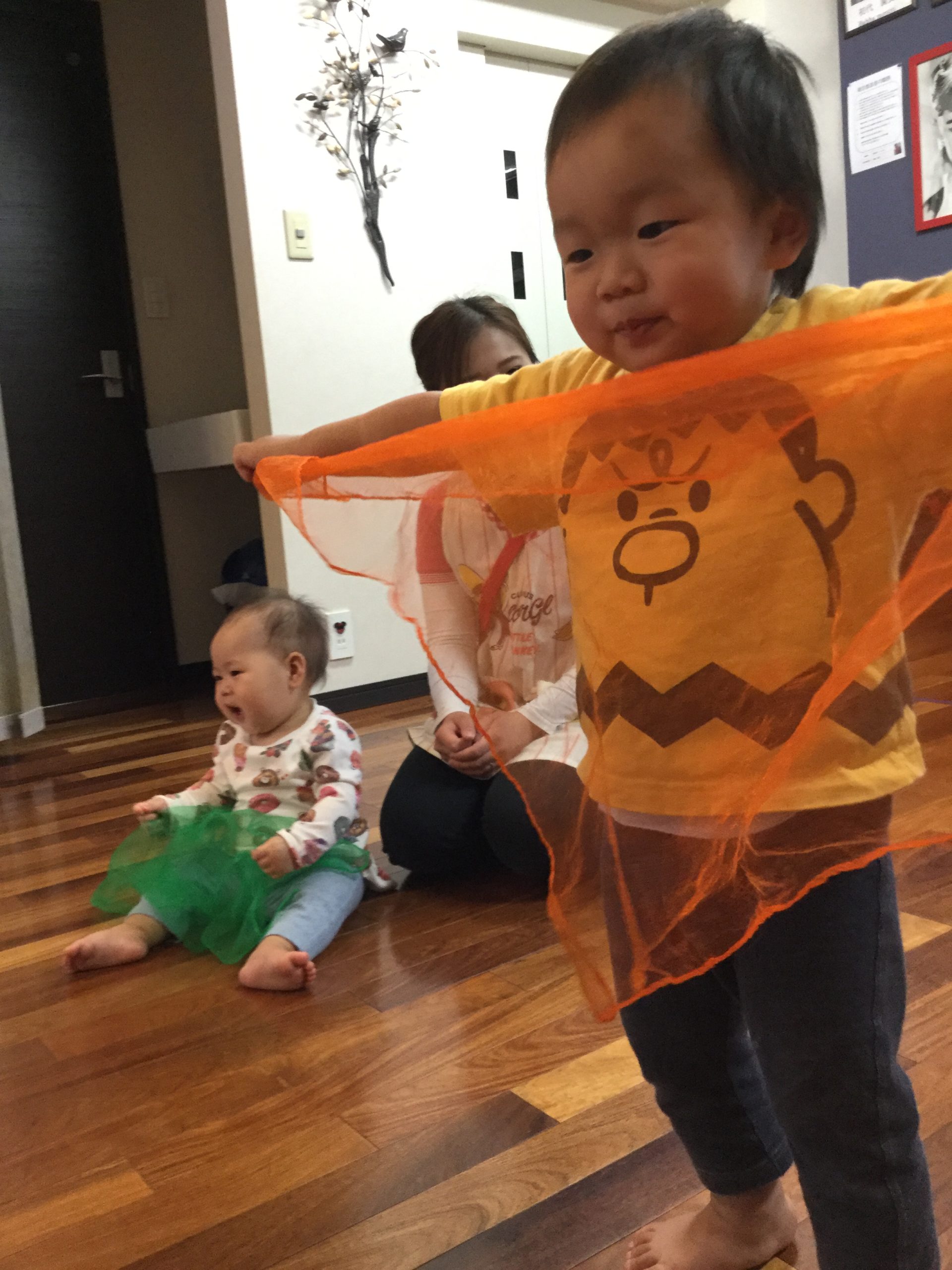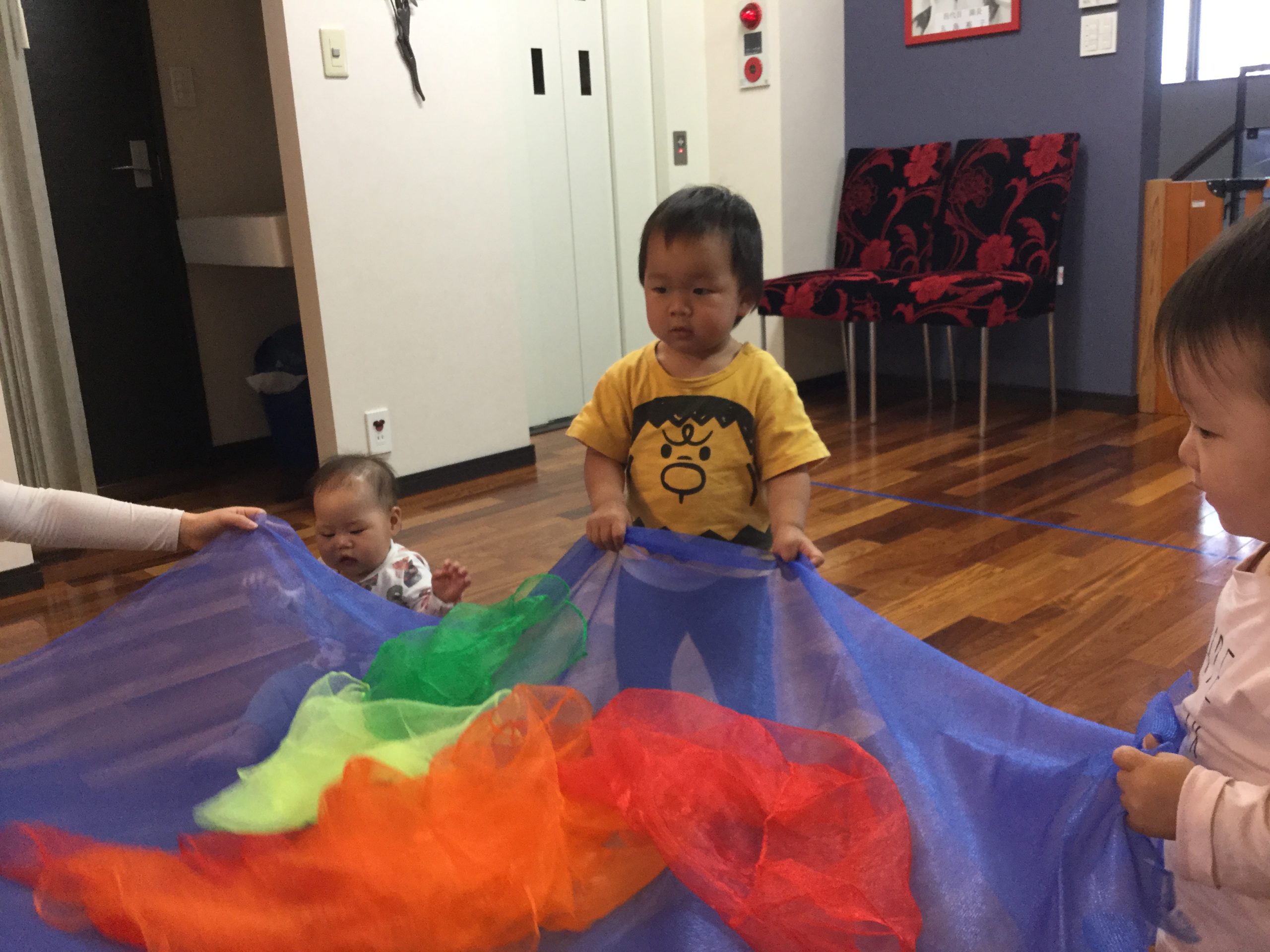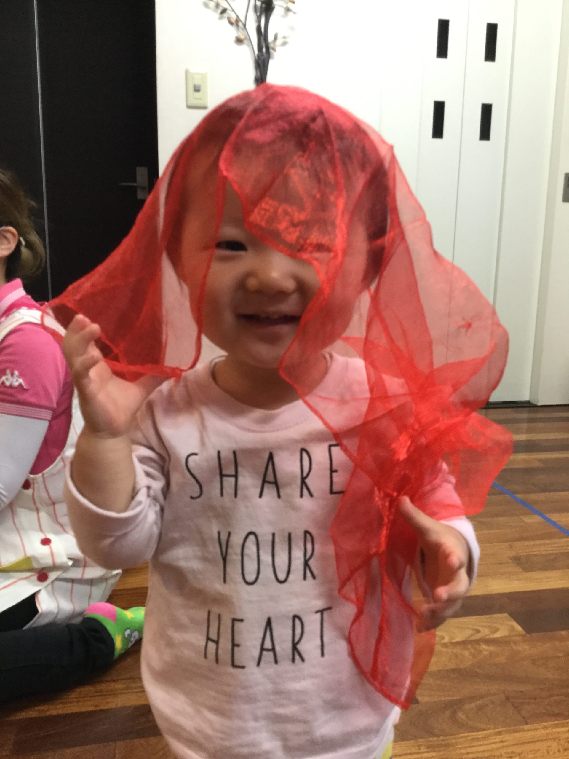 オーガンジーの布遊び、頭にかぶったり、投げたり、楽しかったね(⋈◍>◡<◍)。✧♡