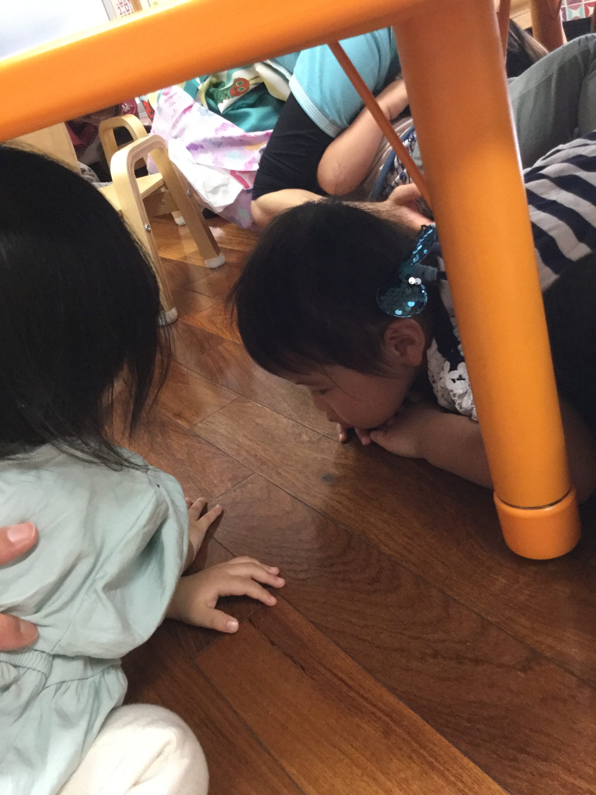 素早く机の下に隠れ、みんなじょうずに”だんごむしポーズ”!