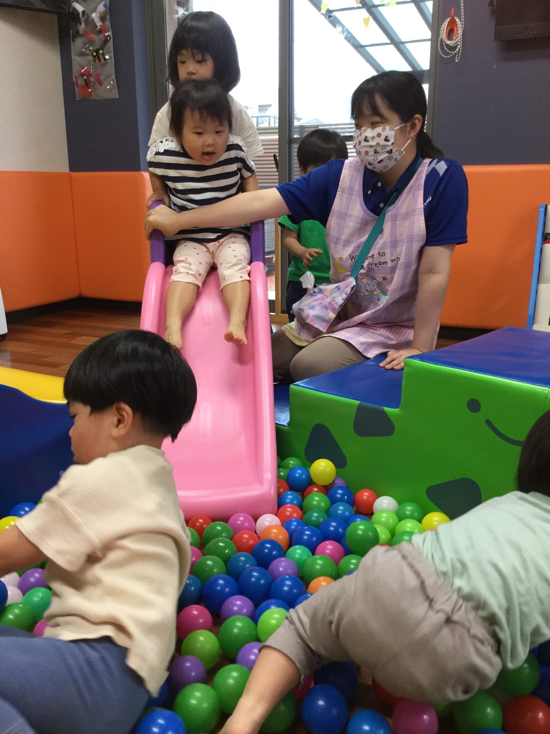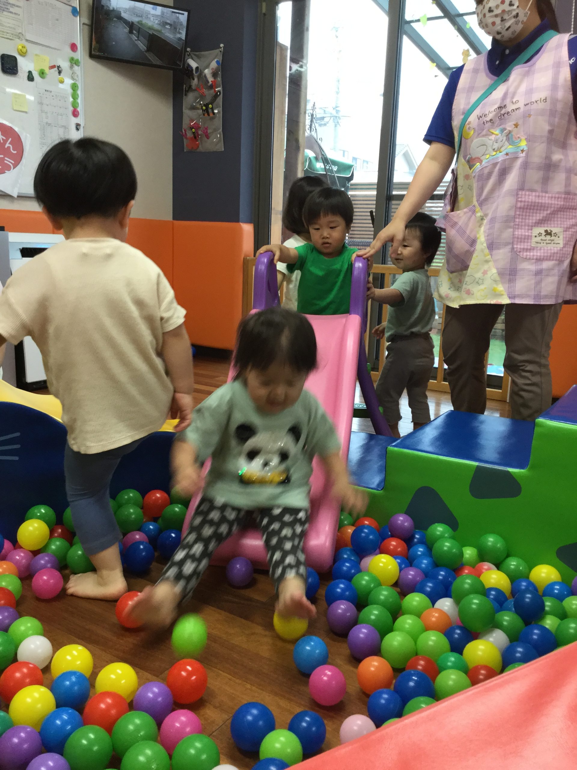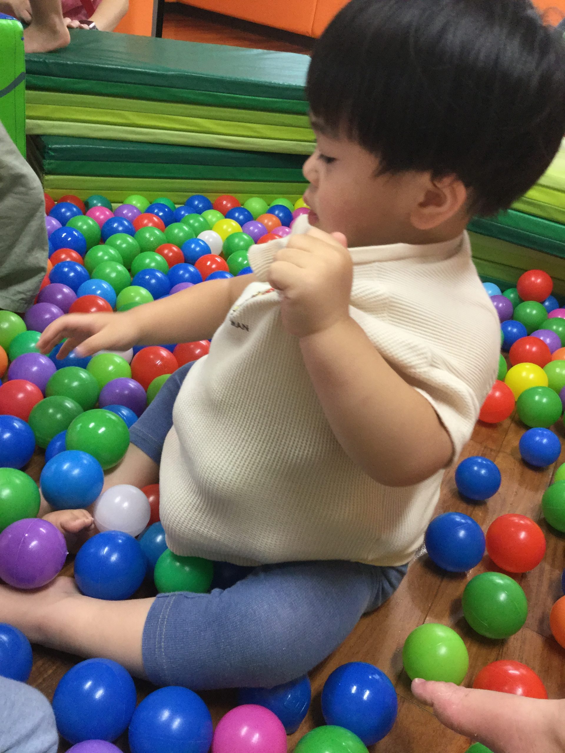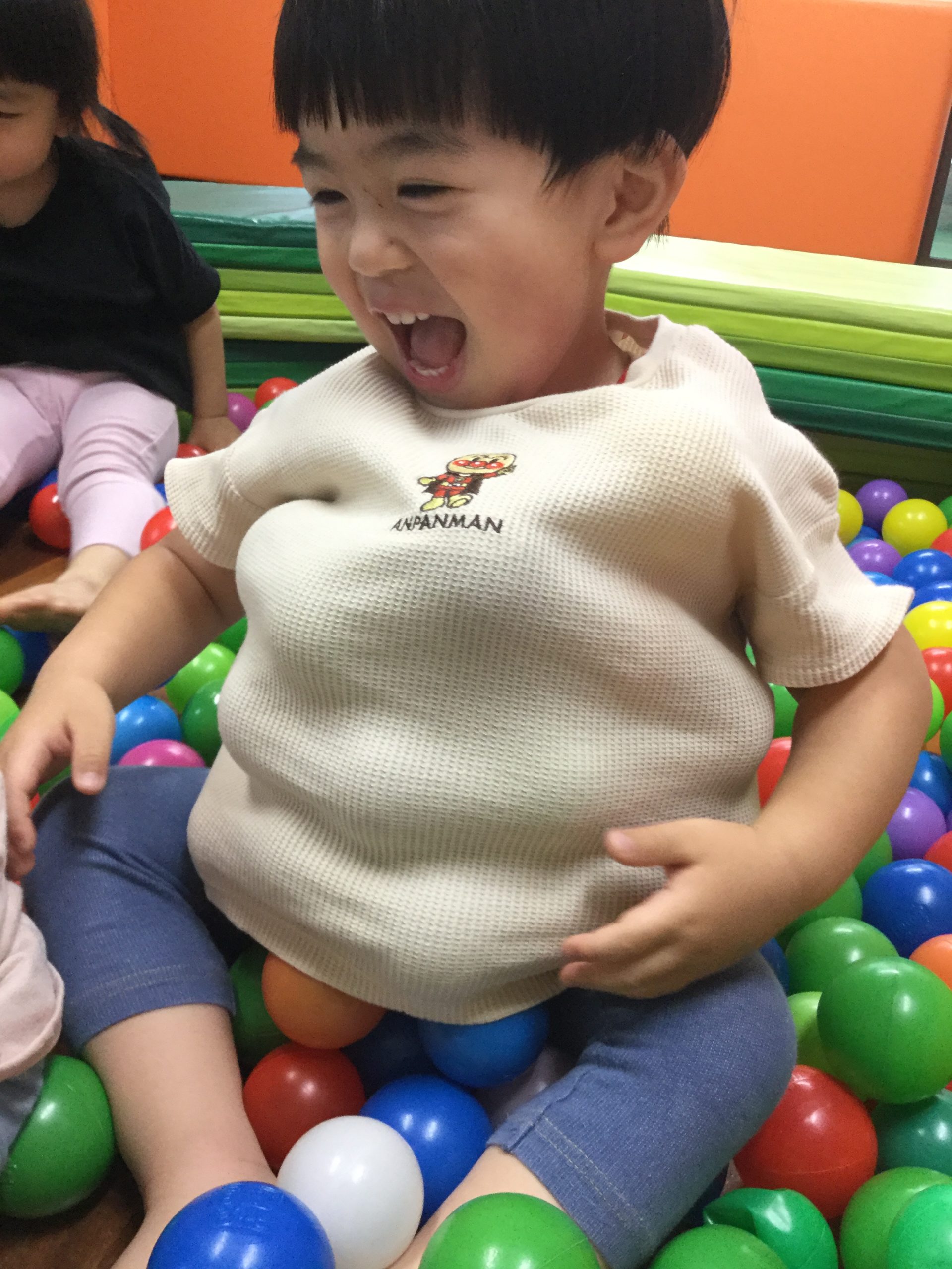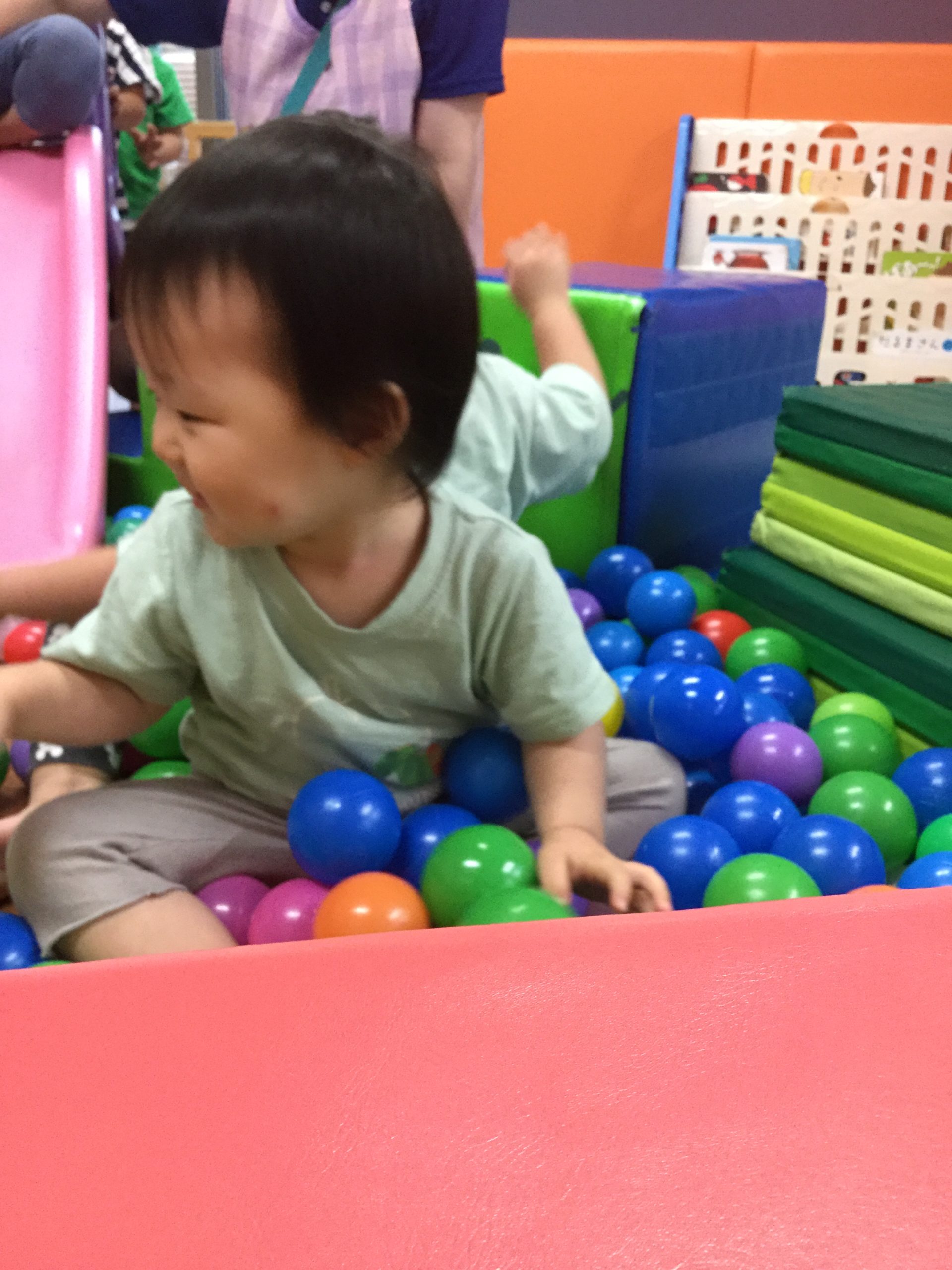 いつも遊んでいるマットでボールプールを作って遊びました(^^♪