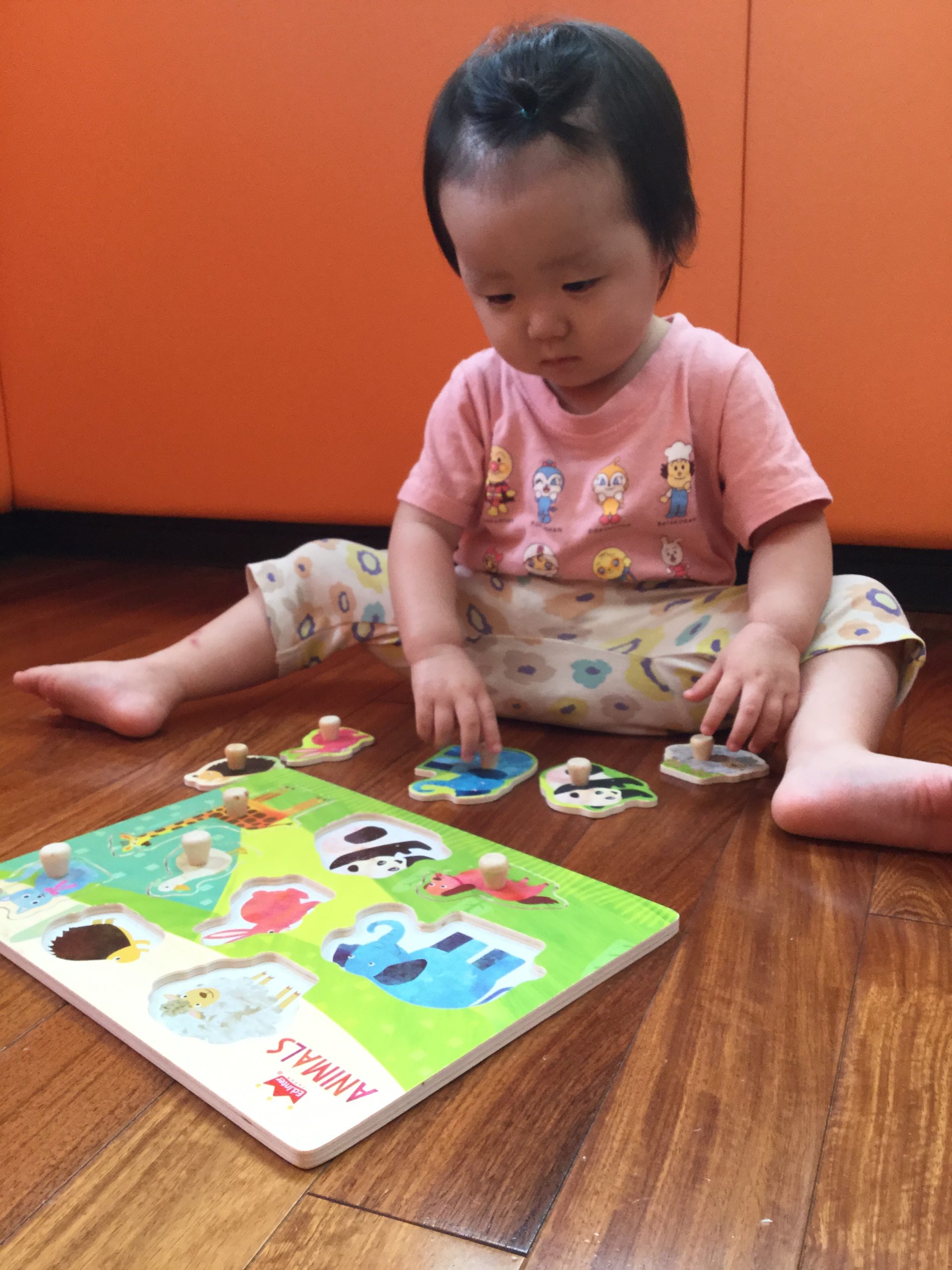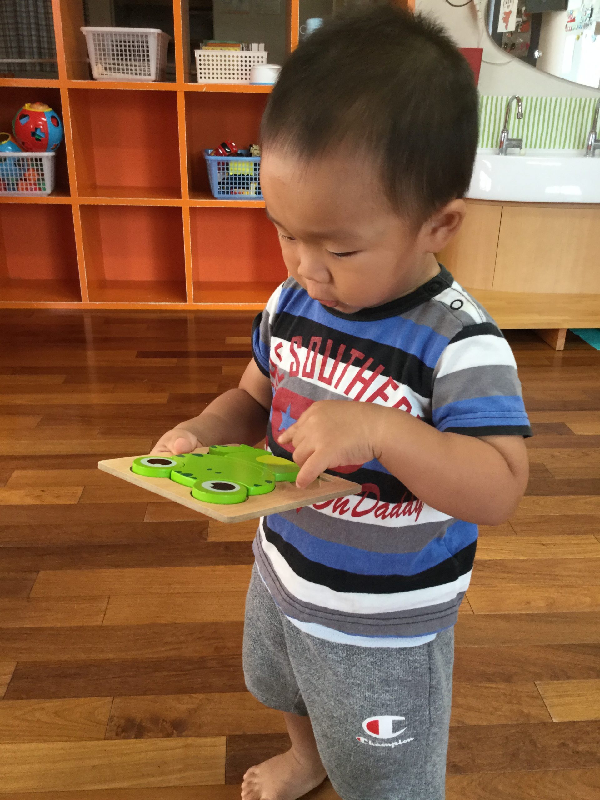 昨年度の卒園生から頂いた、木のぬくもりたっぷりの動物パズル。