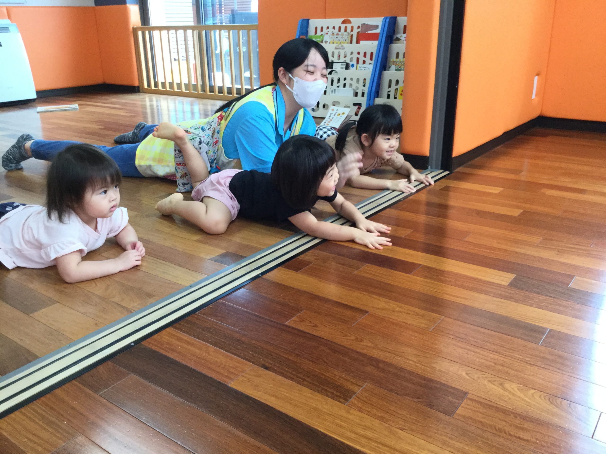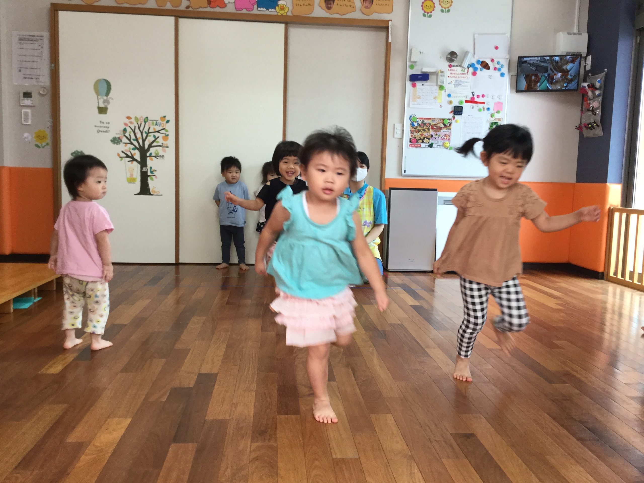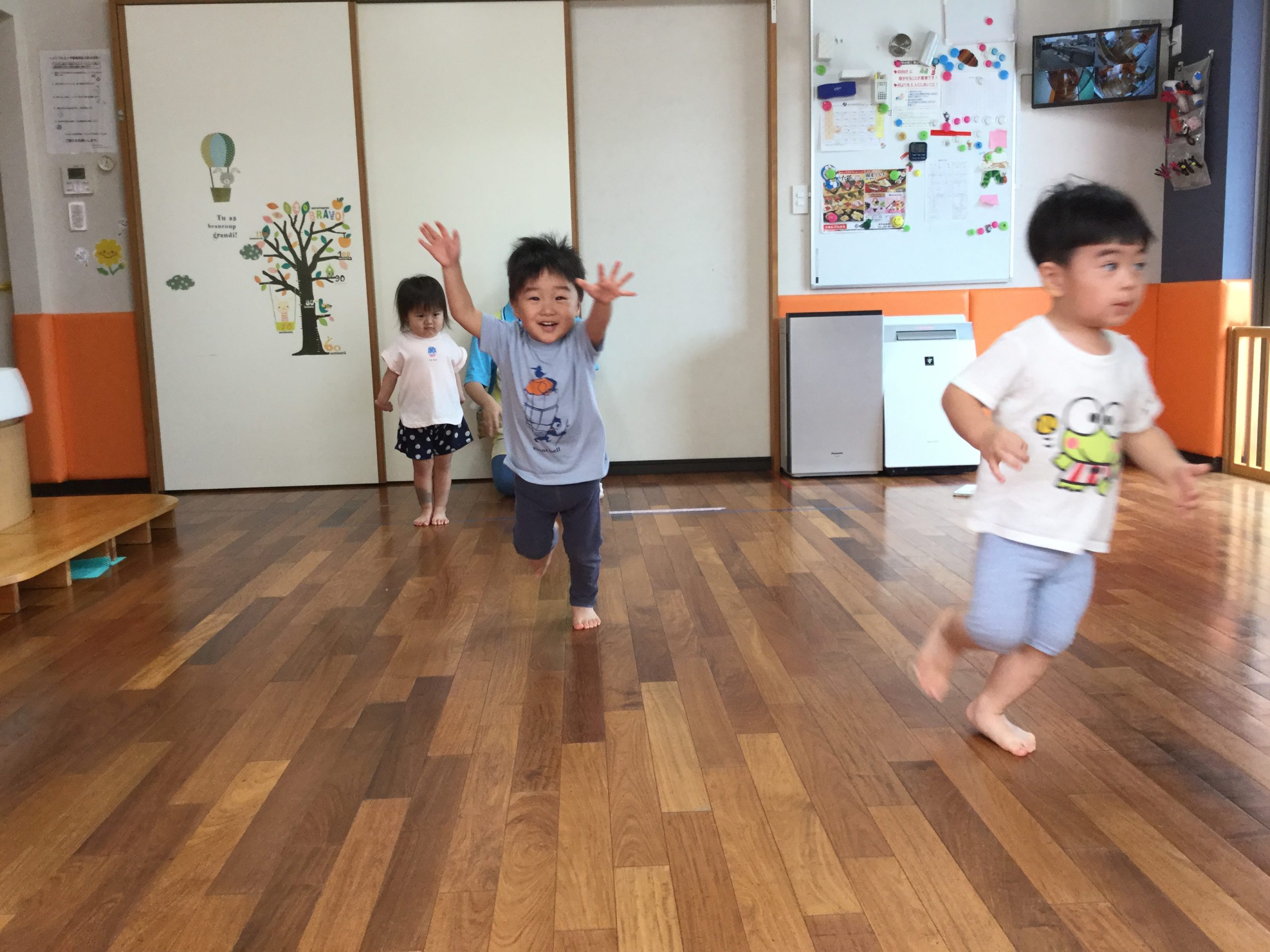 保育室のマットを片付けて、黄色帽子さんがかけっこをしました!