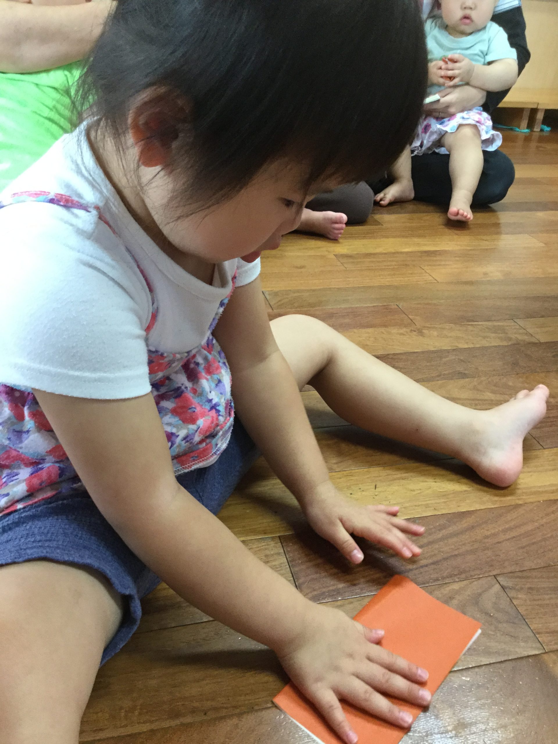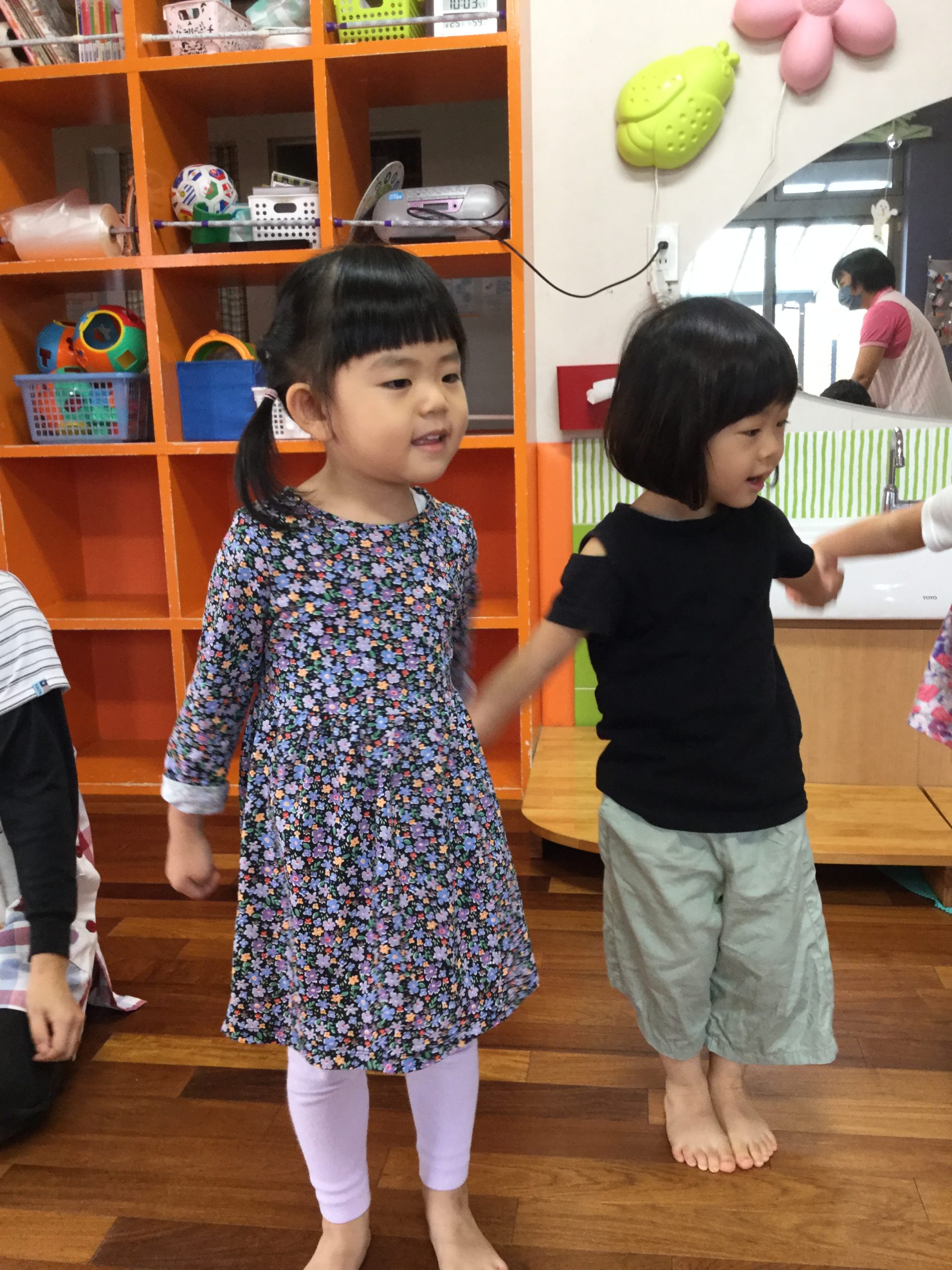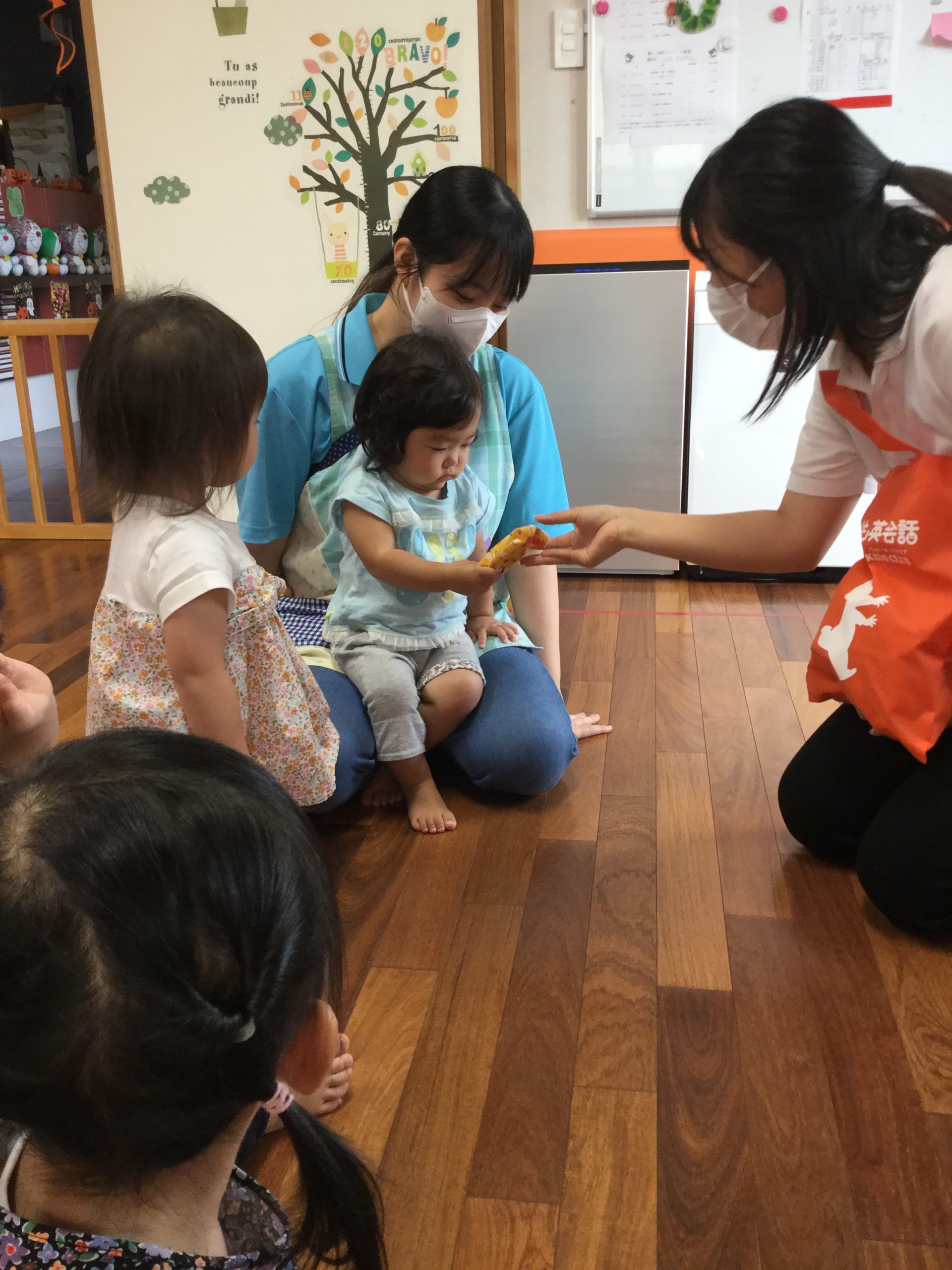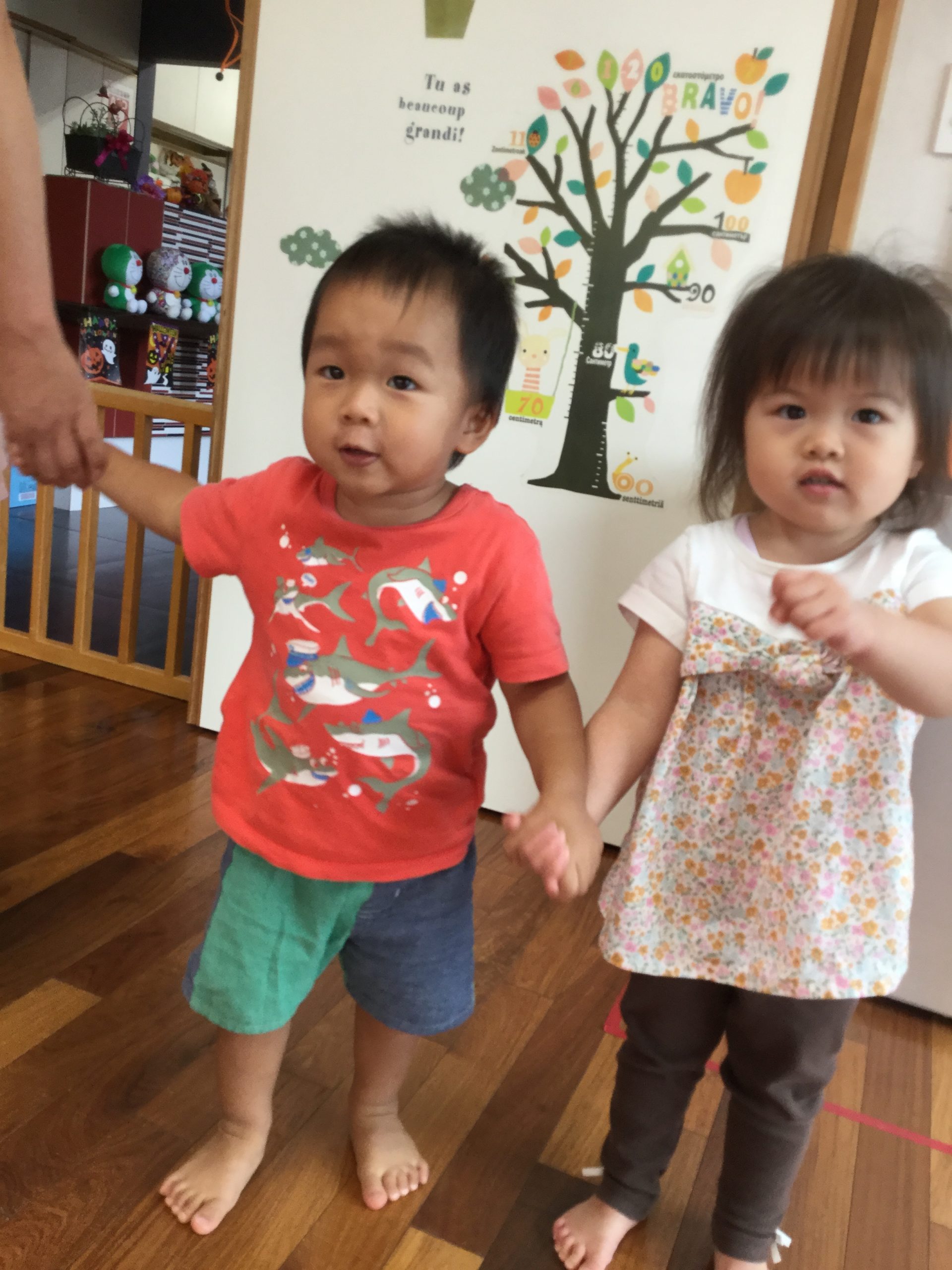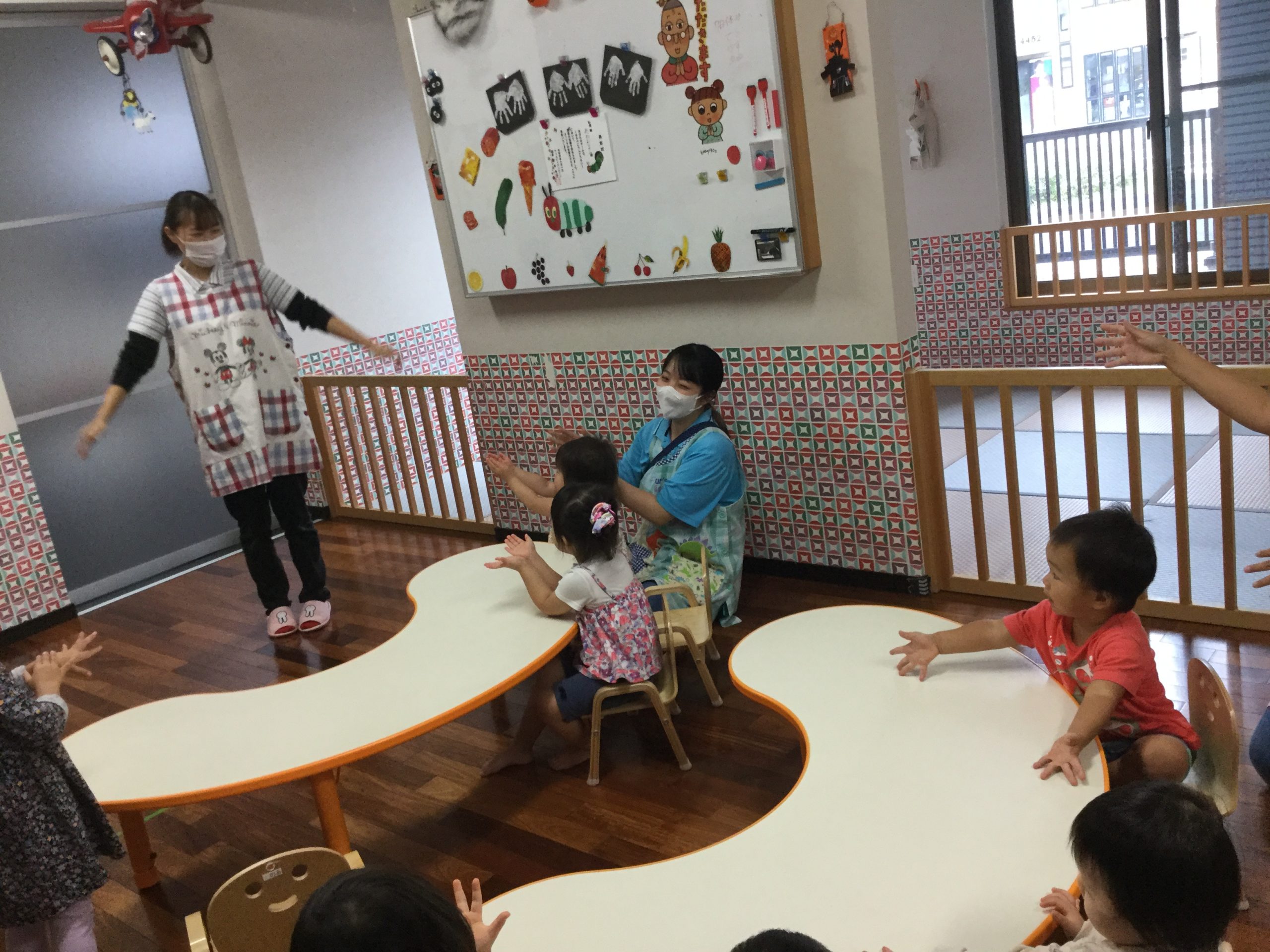 いい子に座っているお友だちのところから、つよしくんが食べ物をもらいに行きます😁😁